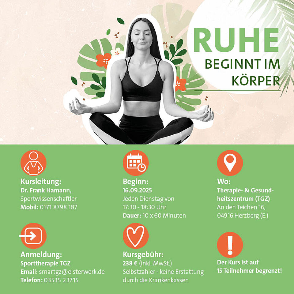 Willst du deinen Körper besser verstehen, Stress leichter bewältigen und dein Wohlbefinden steigern? Unser Kurs hilft dir genau dabei. Du lernst, Dysbalancen in der Muskulatur zu erkennen und gezielt darauf zu reagieren – mit sanften Techniken aus Yoga, autogenem Training und progressiver Muskelentspannung. Einfach, verständlich und ganz entspannt.